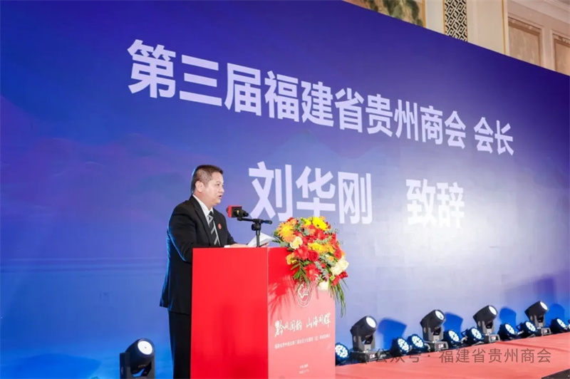 上图:新当选福建省贵州商会会长刘华刚在致欢迎词场景。
